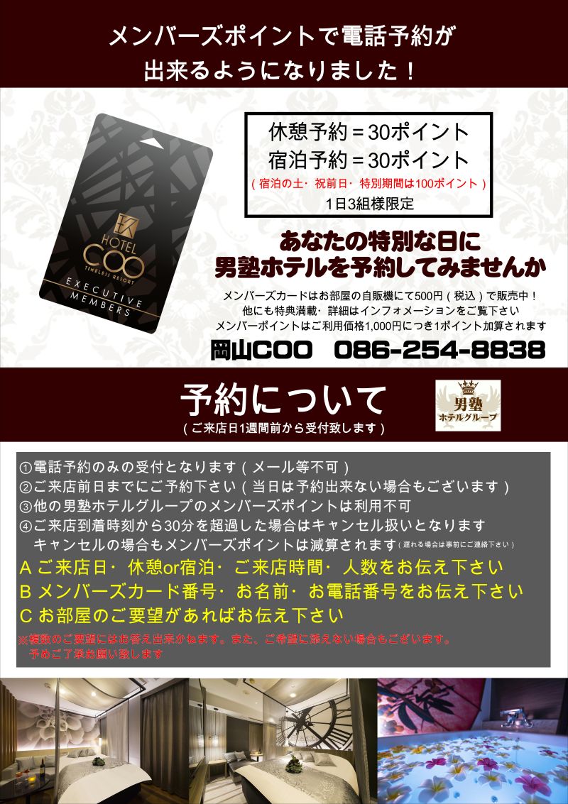 - 休憩・宿泊とも30ポイントでお部屋を確保!お支払いご利用料金はご来店後の当日払いです