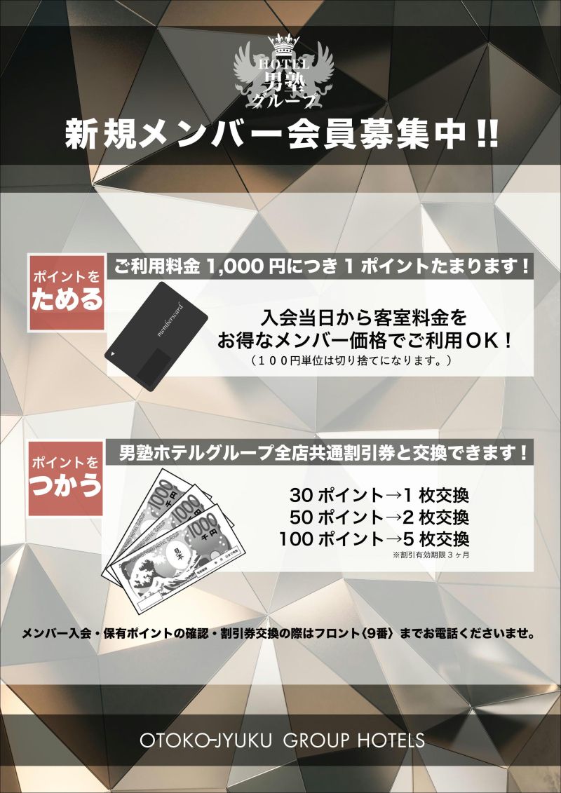 - 全日客室基本料金より ご休憩・ご宿泊共に 1,000円OFF! 買ったその日に元が取れるのでまずは1階精算機横のメンバーカード専用自動販売機よりご購入下さいませ!